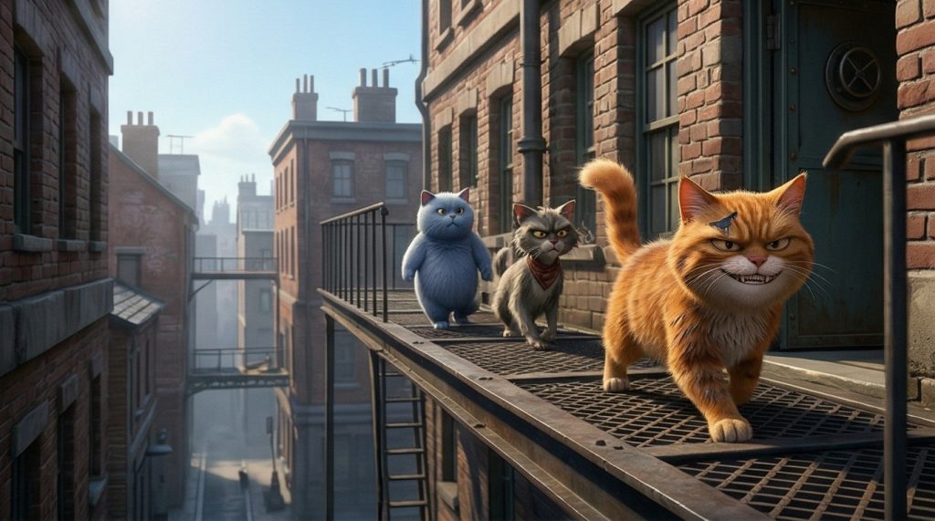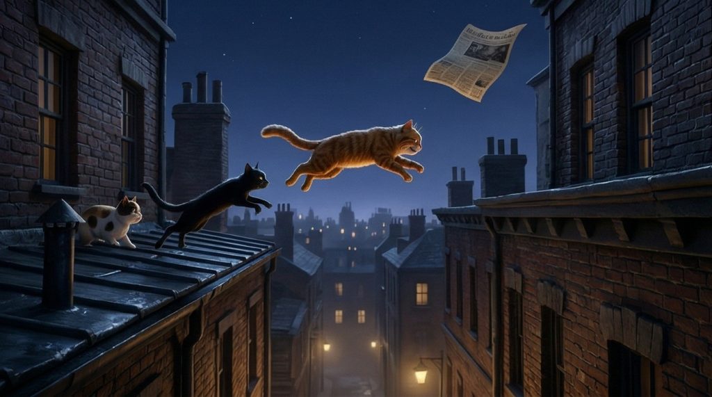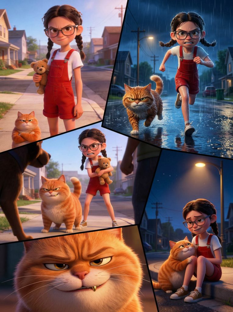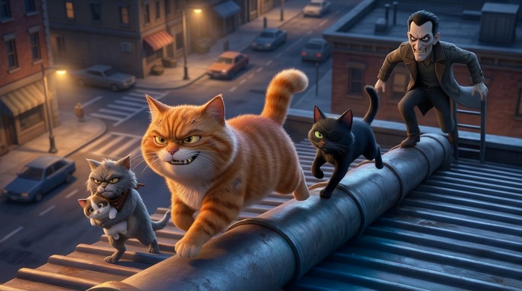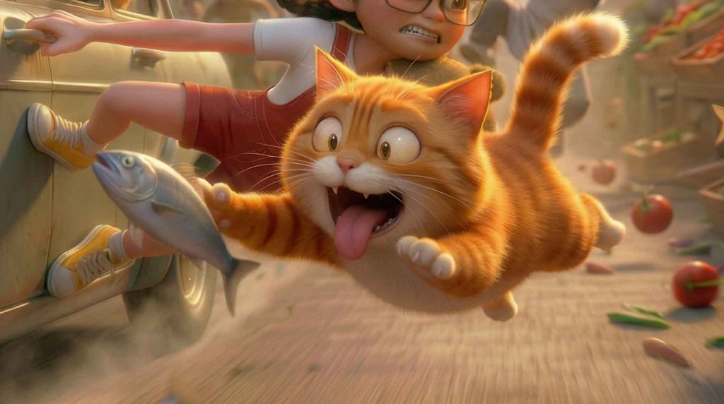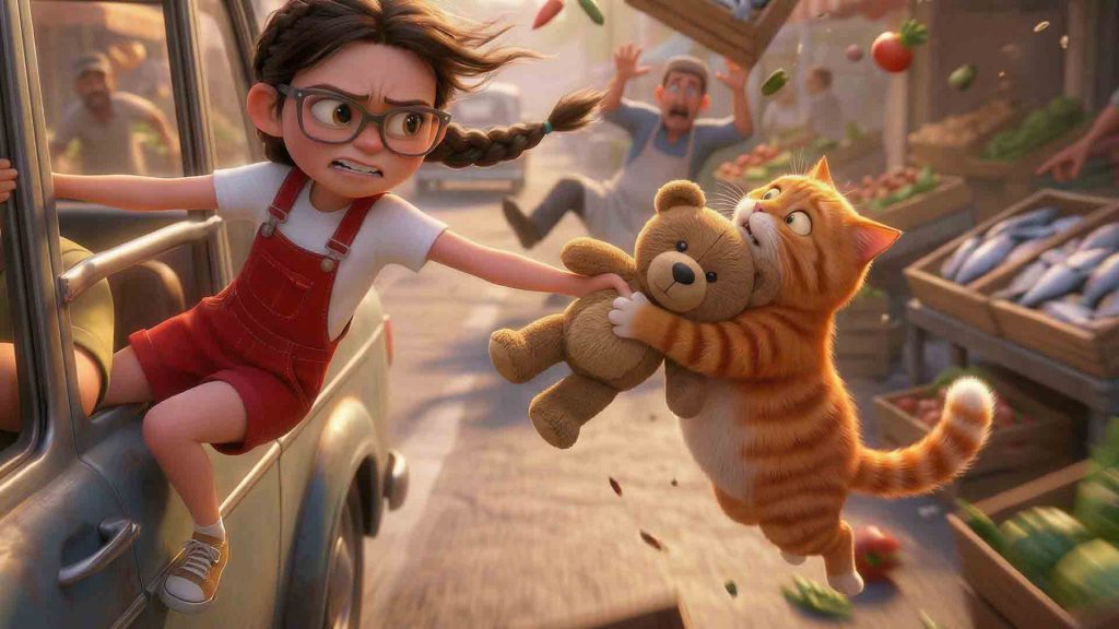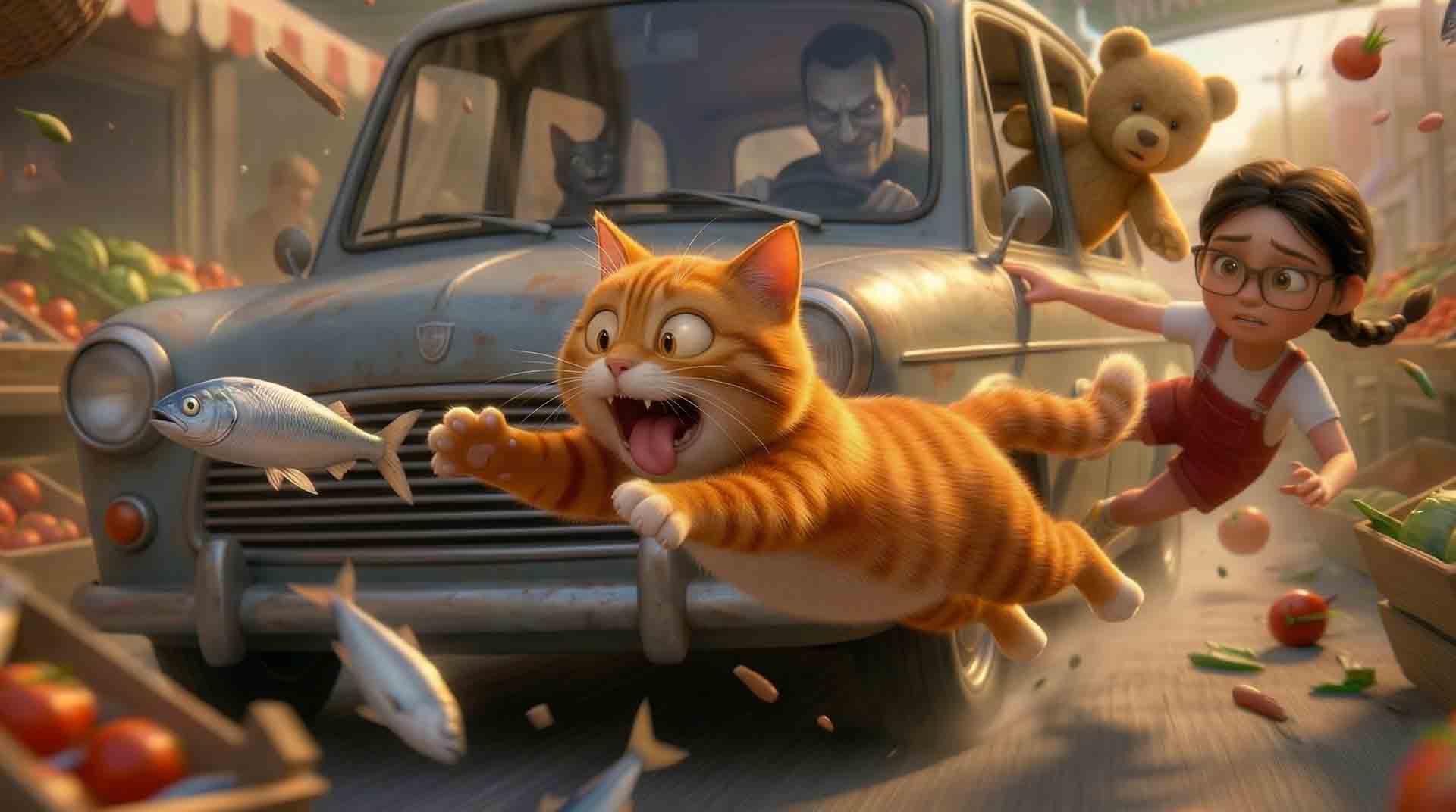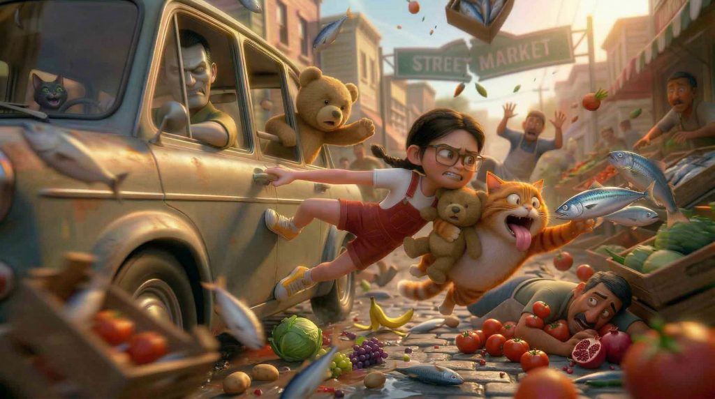 Perseguidos por la ciudad, la niña y el gato atraviesan mercados caóticos, tejados imposibles y callejones oscuros, en una huida donde cada paso los acerca más al peligro…